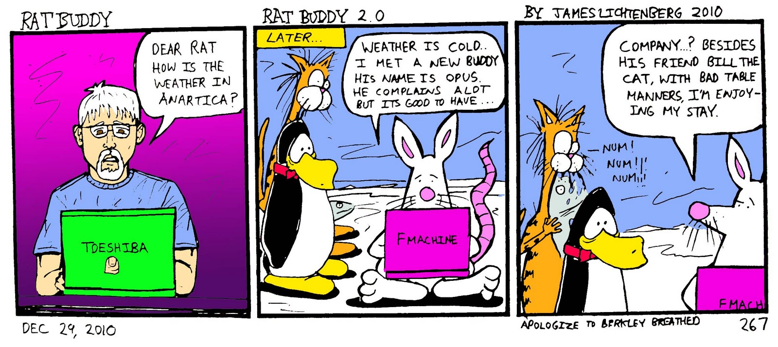 Rat Buddy, a giant rat, is friends with a cat named, Bullet. The two were created by Paul. Paul is mad scientist. A new character is Archea, she time travels with her VR set. The comic has been going for 24 years and started on the back of envelope. Cheers! Rated R